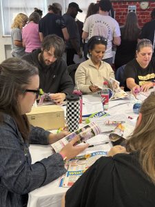 Afterwards, Eve guided us into a new exercise. She brought our attention back to the five characters around the room and asked whether, during our first visit with them, we’d felt we’d had enough time. She had purposefully kept that first encounter brief, a way of showing us how much can be missed when we rush, and how important it is to slow down and give each moment the attention it deserves. From there, she divided the room in half again. One half were given a list of fifty questions, each group focusing on one character and digging deeper into their identities. The rest of were tasked with something more creative, making posters about the family members we support. The idea was to create an ‘identity board’ for them, capturing who they are beyond just their needs. Tables were scattered with pens, glue, and magazines, ready for us to cut out words and images that represented their lives and personalities. It was a chance to think differently, to build a picture of a person in a way that was visual, expressive, and personal.
